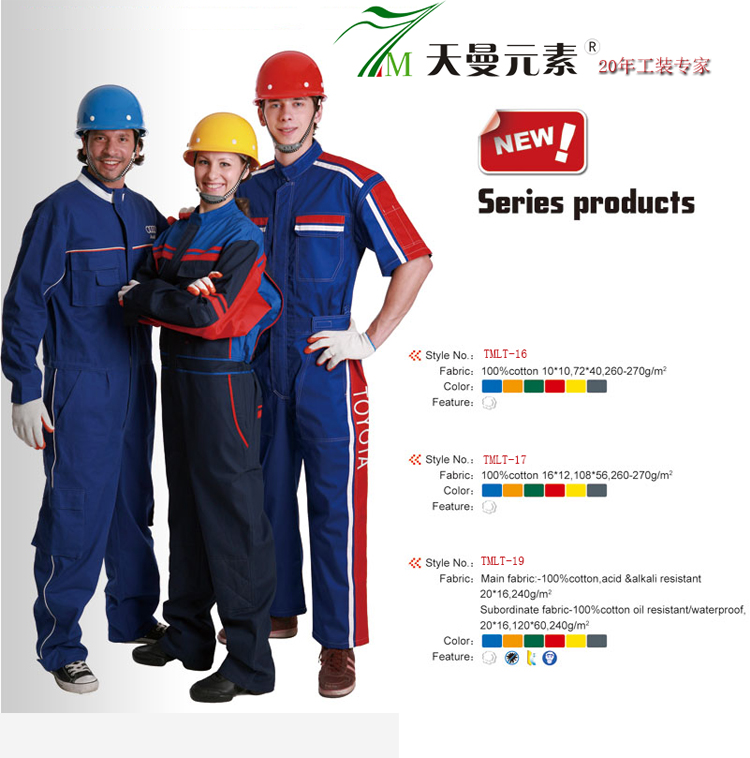 - 產(chǎn)品簡(jiǎn)介:產(chǎn)品詳細(xì)描述 : TMLT-16 面料:100% 純棉,10*10,72*40,260-270 GSM;前胸繡花汽車品牌標(biāo)志,前門襟樹脂拉鏈,兩個(gè)帶蓋胸兜和兩個(gè)斜插褲兜,后背臀部貼兜,腿部工具兜,腰部松緊帶 TMLT-17 面料:100% 純棉,16*12,108*56,260-270 GSM;前胸繡花標(biāo)志,前門襟樹脂拉鏈,兩個(gè)帶蓋胸兜和兩個(gè)斜插褲兜,后背臀部貼兜,腿部工具兜,腰部松緊帶 TMLT-18 面料:100% 純棉,20*16,240 GSM,防酸,防堿;腿部TOYOTA繡花標(biāo)志,前門襟樹脂拉鏈,兩個(gè)帶蓋胸兜和兩個(gè)斜插褲兜,后背臀部貼兜,腿部工具兜,腰部松緊帶,腰部魔術(shù)貼可以調(diào)節(jié)松緊。